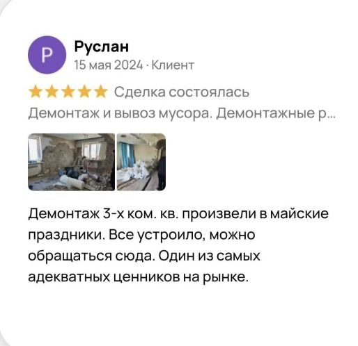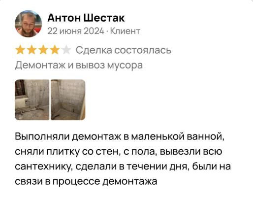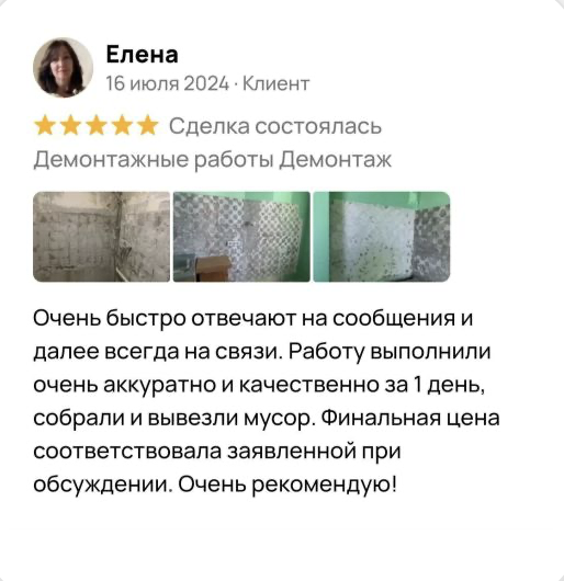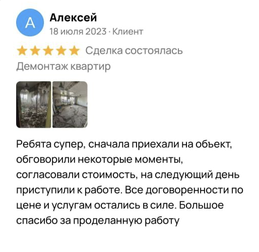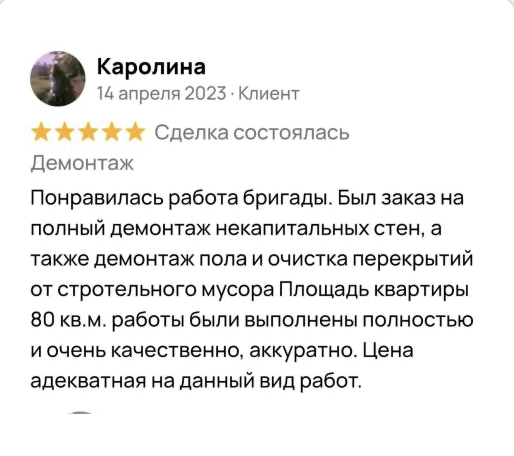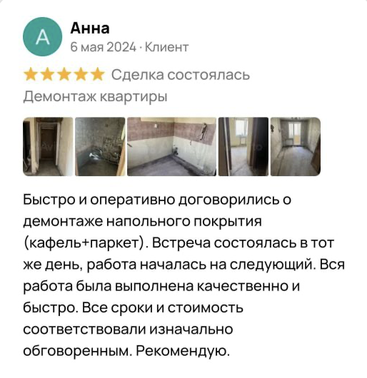 Работаем аккуратно, строго под руководством прораба. Сохраним трубы и проводку целыми. Соблюдаем «закон о тишине», чтобы у вас не было проблем с соседями.