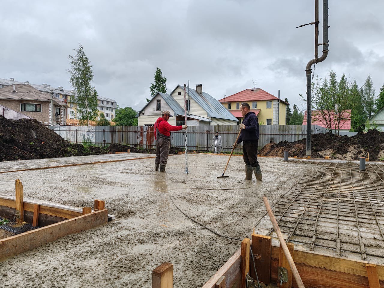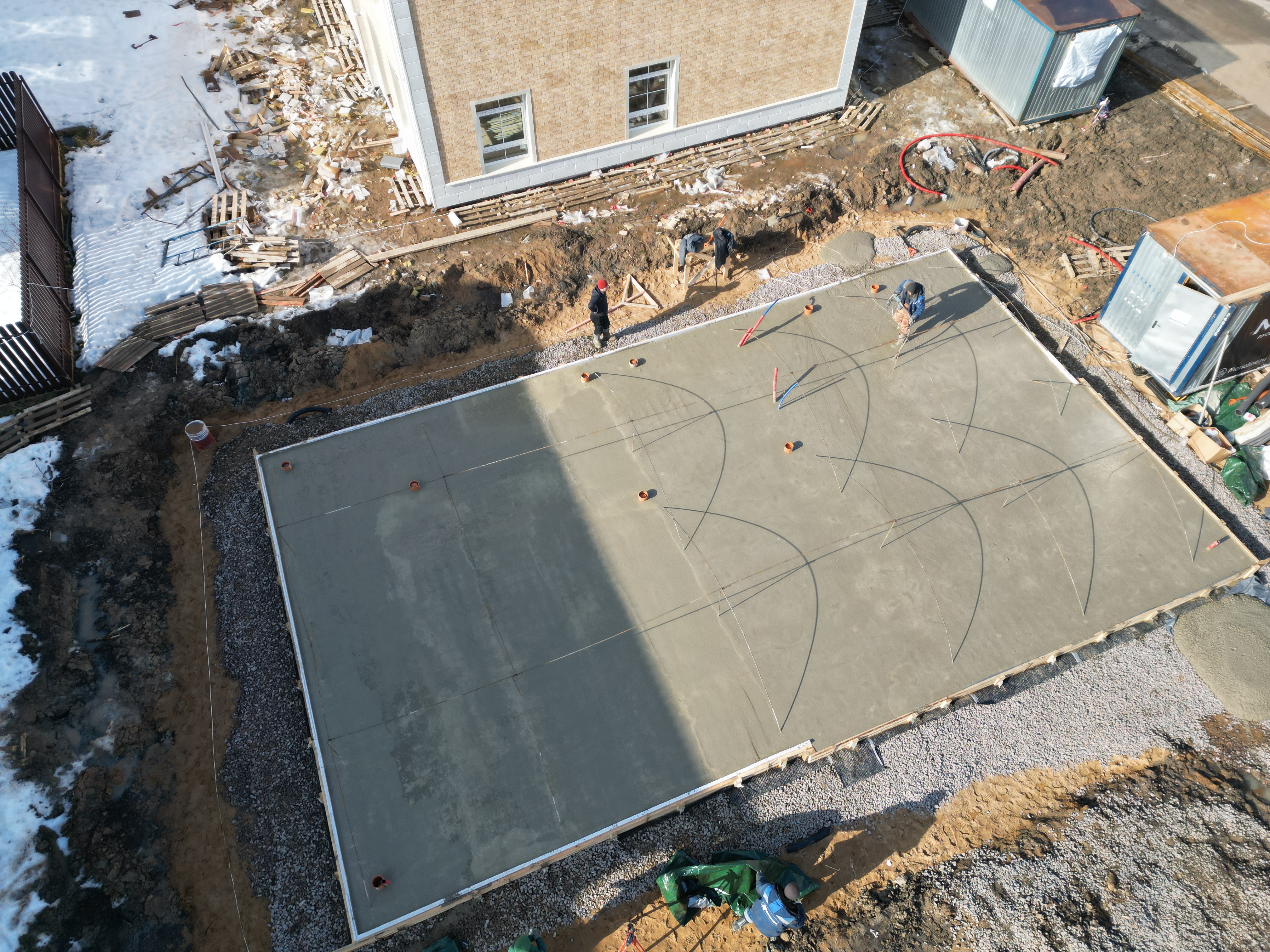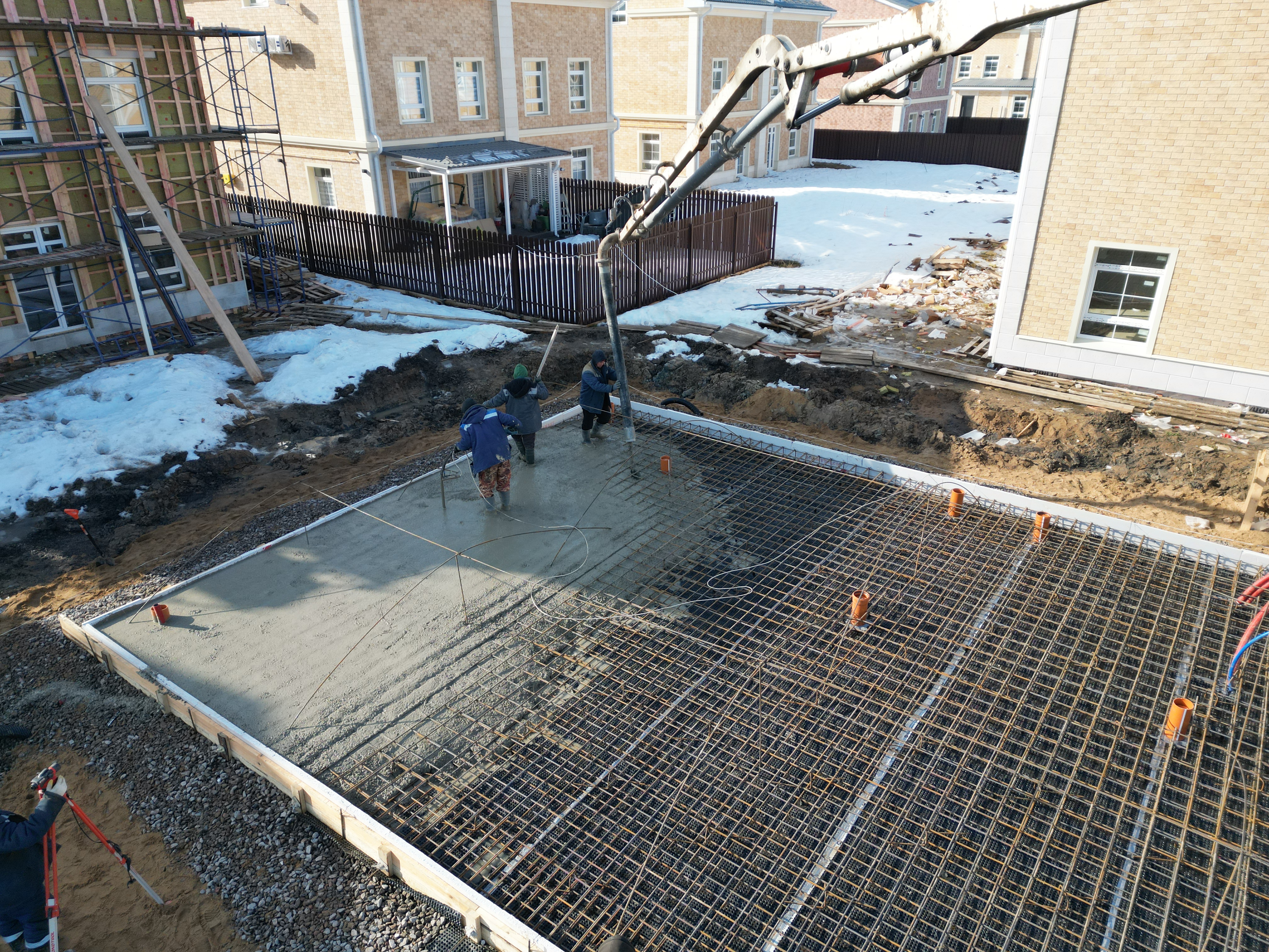 Бетон подавался бетононасосом с непрерывным контролем горизонта по лазерному нивелиру для получения идеально ровной поверхности.