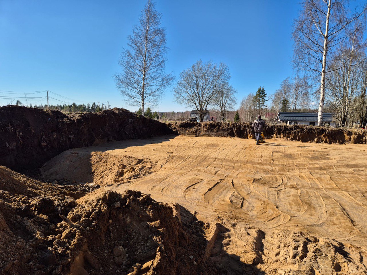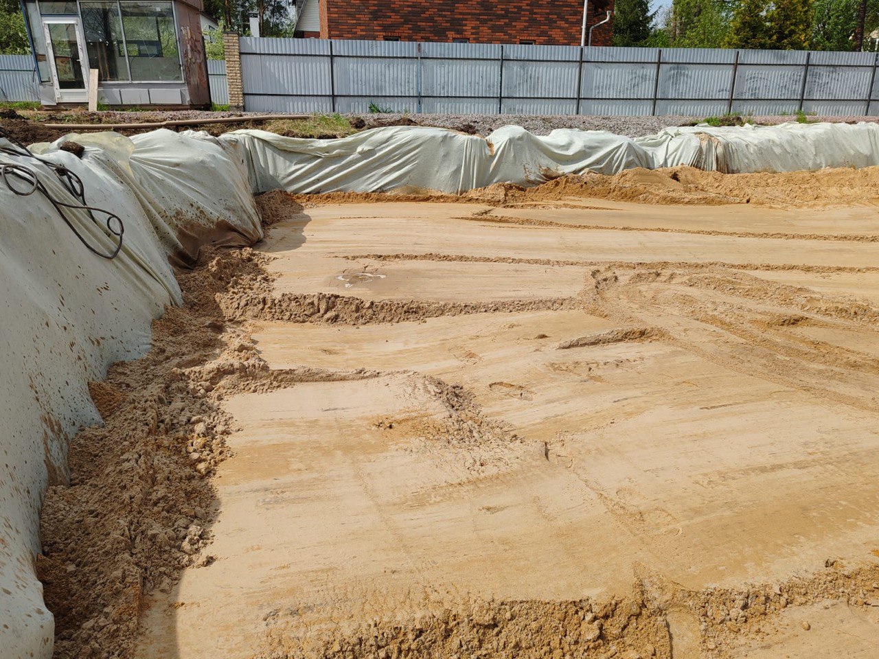 Выполнили полный нулевой цикл. Сделали выемку грунта, уложили геотекстиль и провели послойную вибротрамбовку песчаной подушки.