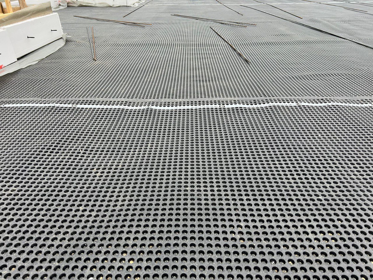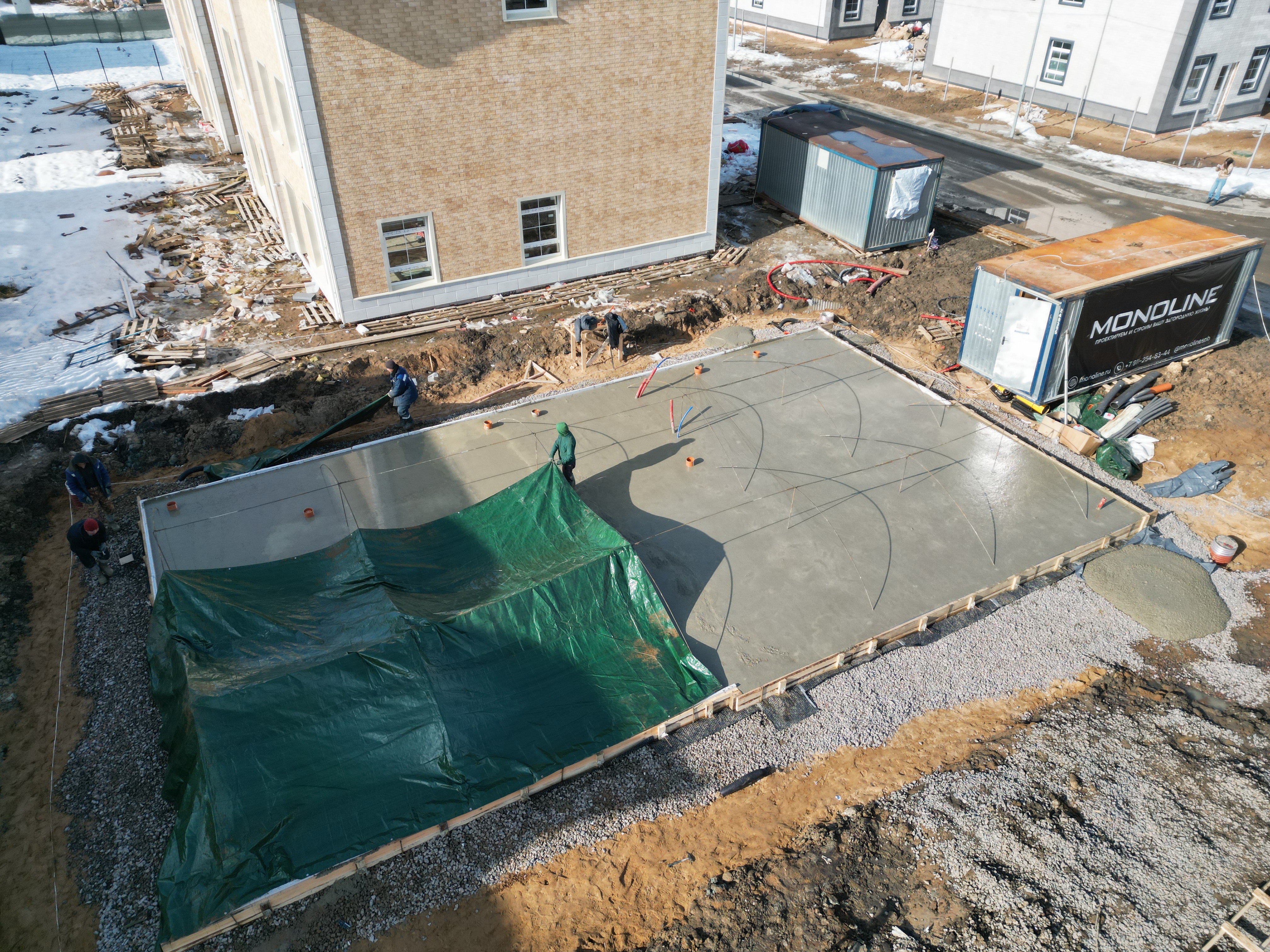 Заливка производилась непрерывно с помощью бетононасоса. Для правильного набора прочности бетона готовую плиту укрыли защитными тентами.