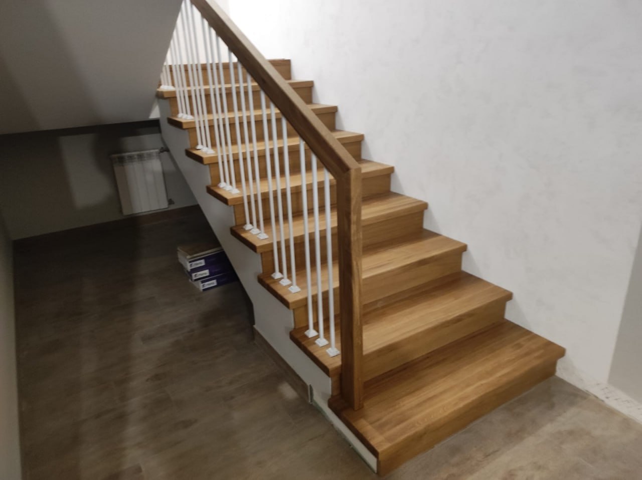 Выполнили полную обшивку каркаса ступенями и подступенками из дуба. Закрытая конструкция скрывает изнанку металла и обеспечивает отличную шумоизоляцию.