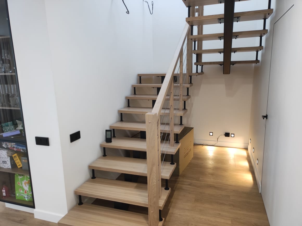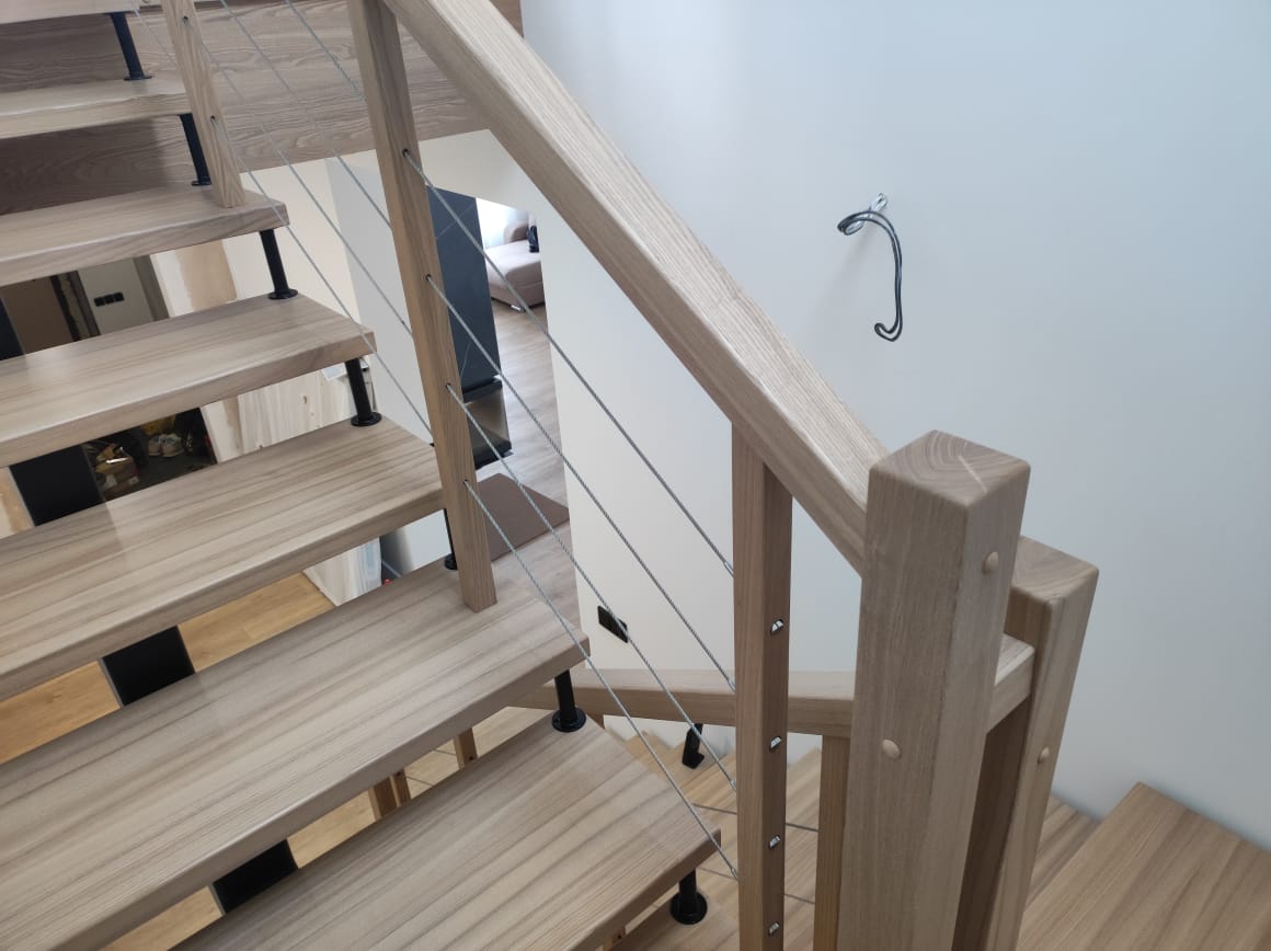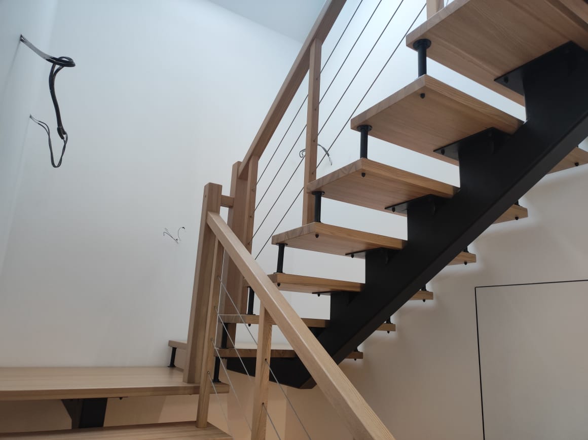 Легкая и прочная конструкция на металлическом каркасе. Ступени из массива ясеня без подступенков пропускают свет, сохраняя ощущение простора в помещении.