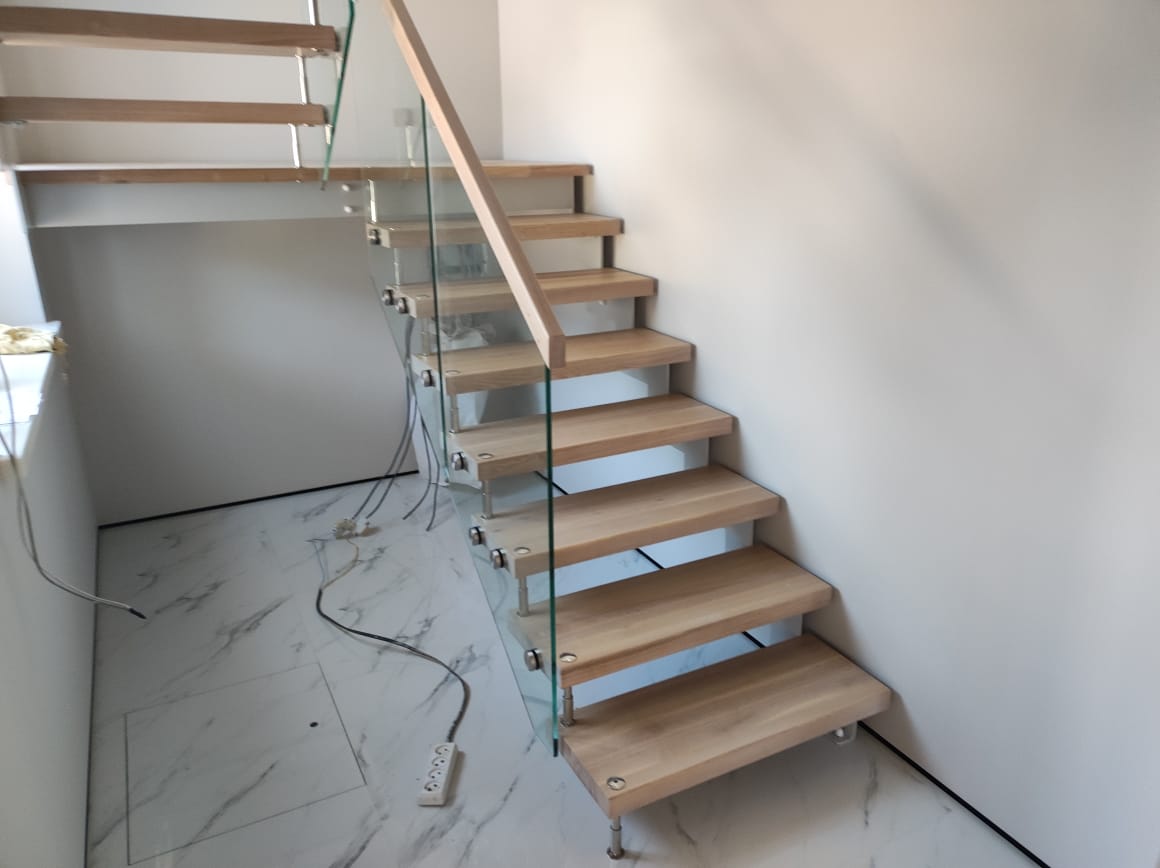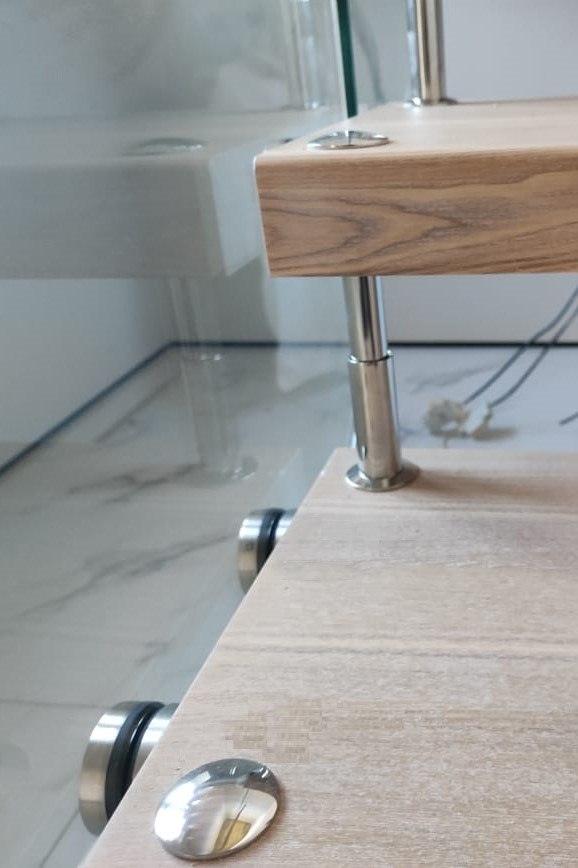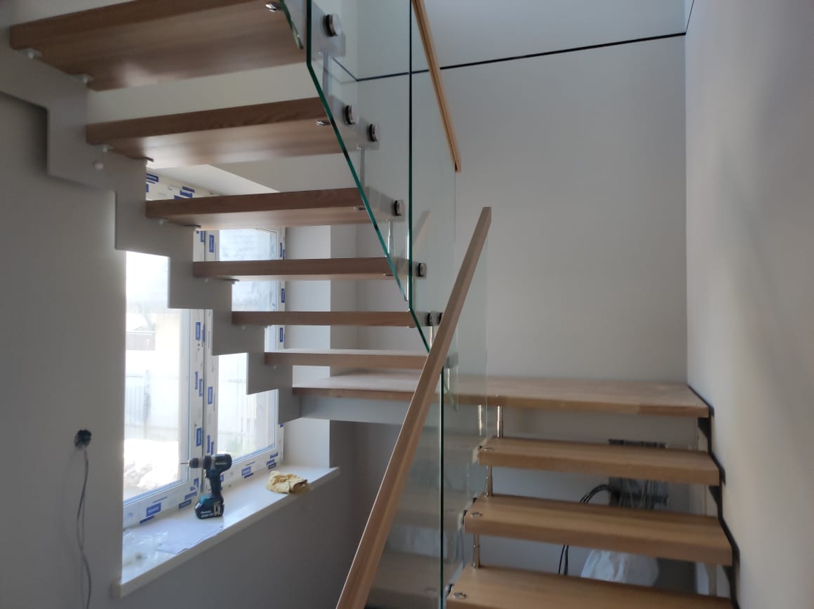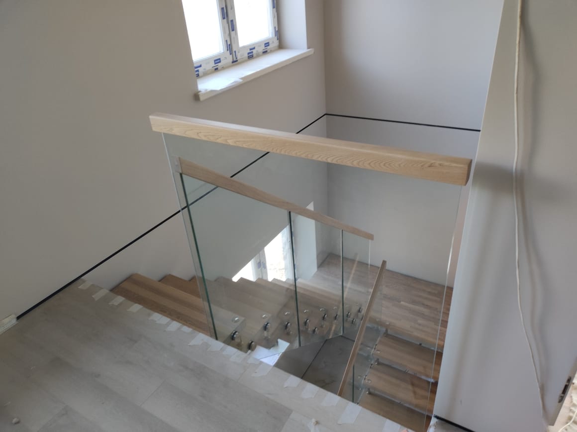 Ограждение выполнено из самонесущего закаленного стекла на точечных держателях. Такое решение подчеркивает современный стиль и обеспечивает безопасность, не загораживая обзор. Дубовый поручень гармонично завершает композицию.