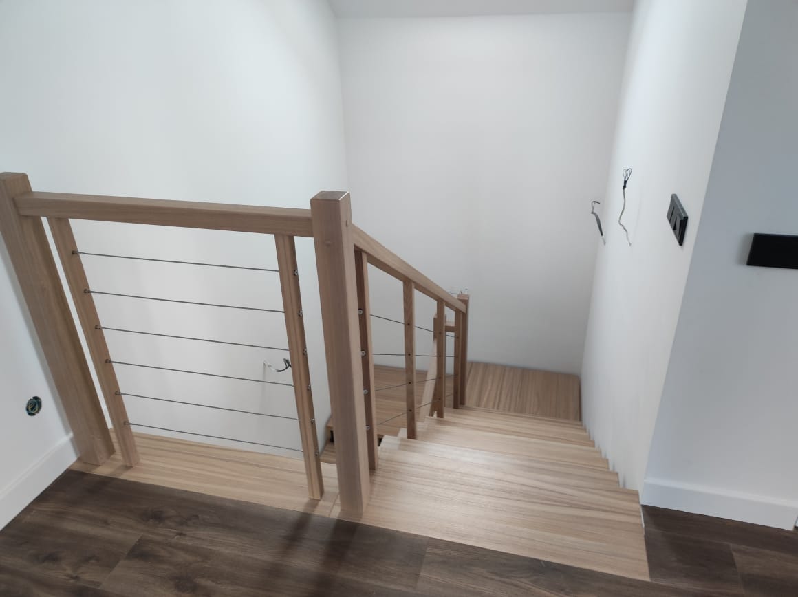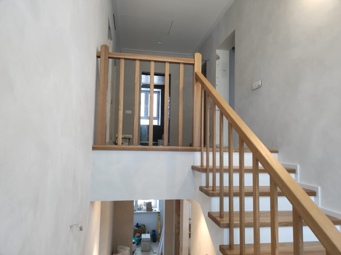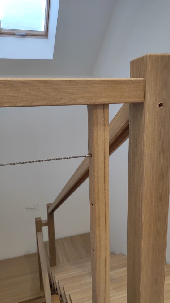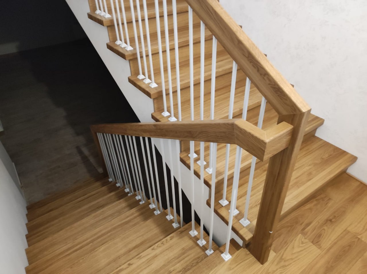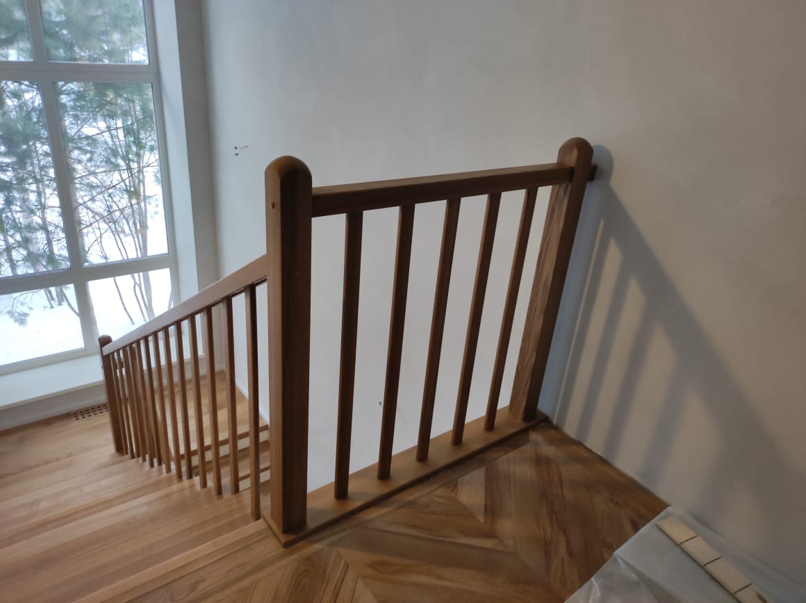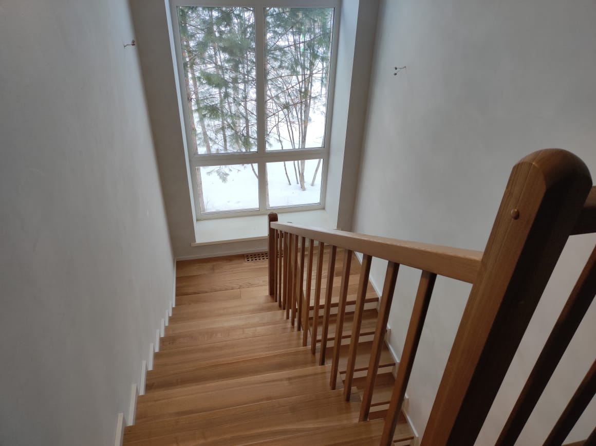 Практичное решение в скандинавском стиле. Ступени и классическое ограждение выполнены из массива ясеня — светлого и прочного дерева.