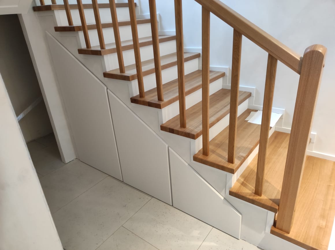 Главная особенность — функциональность. Пространство под лестницей не пропадает: мы встроили глубокие выкатные короба, которые заменяют полноценный шкаф-кладовую.