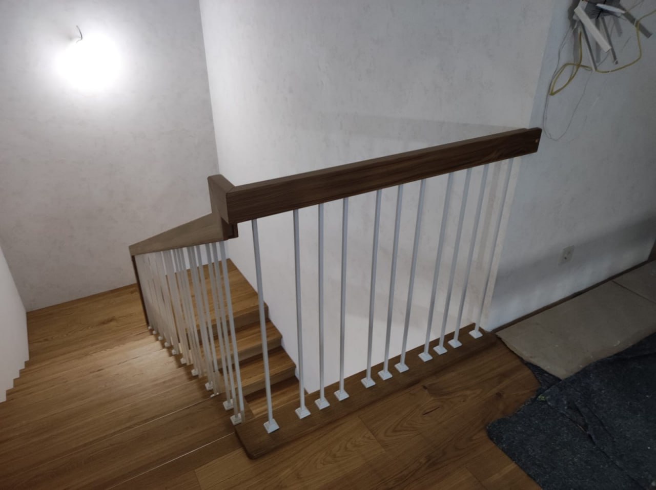 Ограждение из тонких металлических балясин добавляет интерьеру легкости, а жесткий самонесущий поручень из дуба гарантирует безопасность спуска.